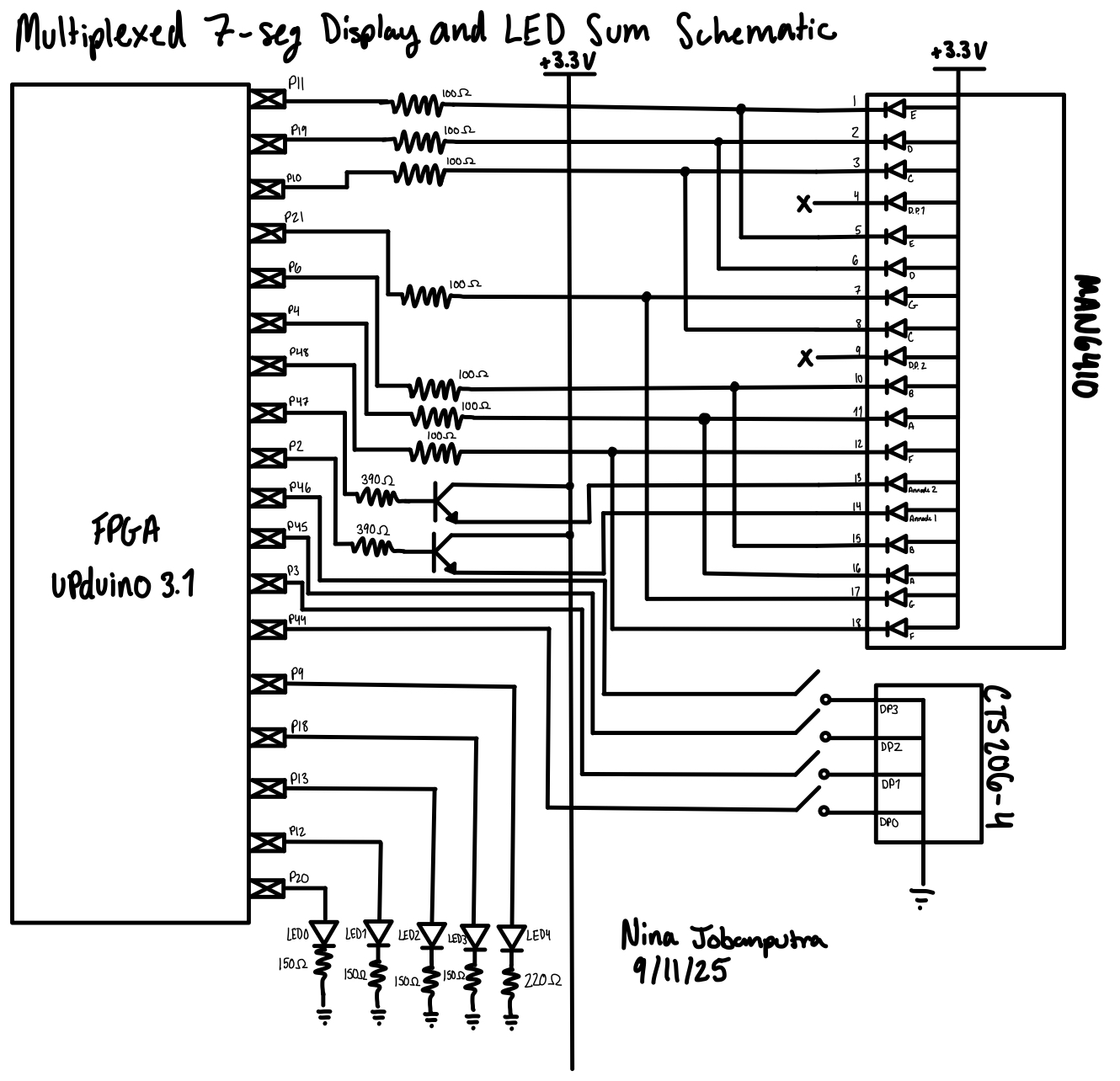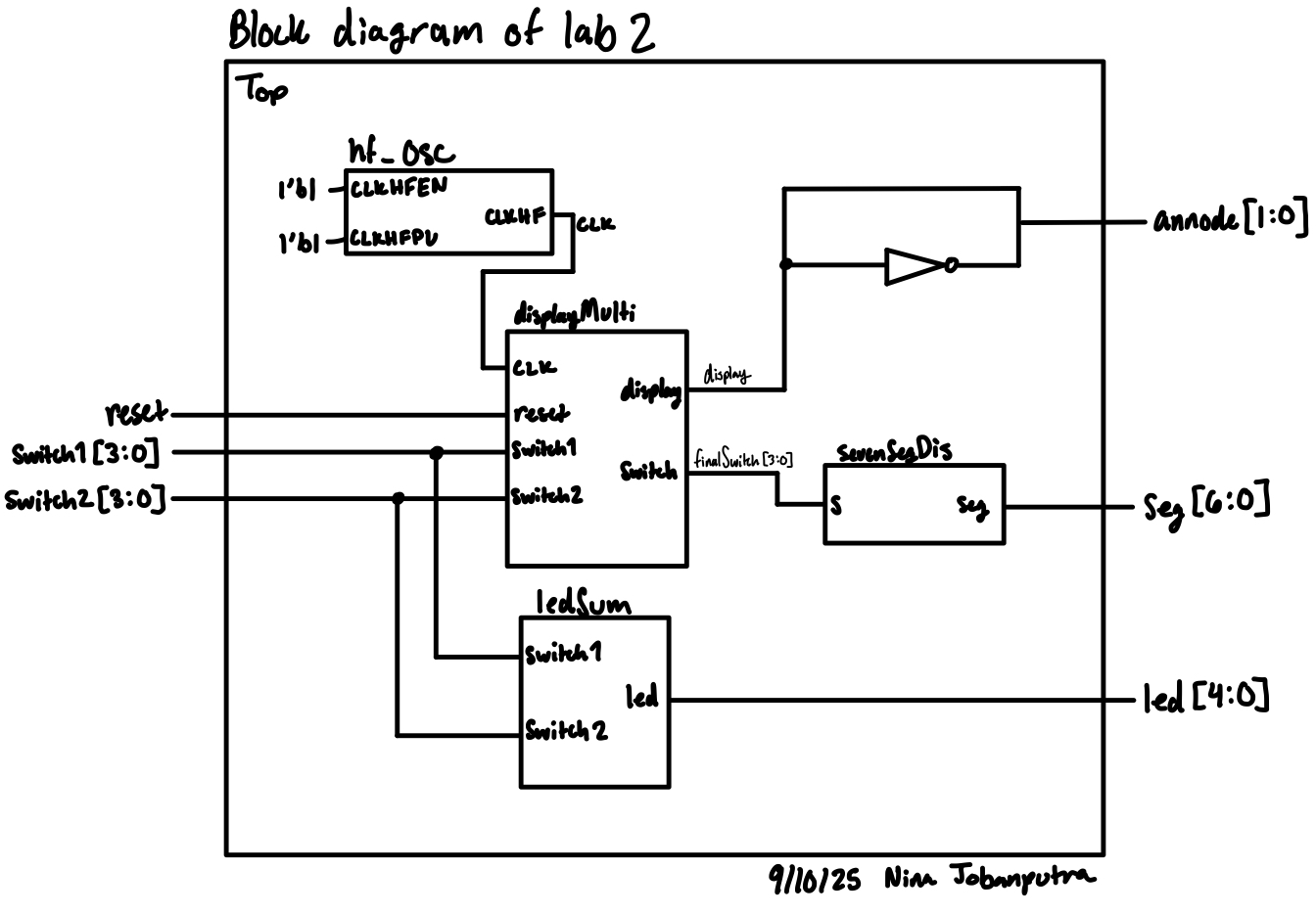 In this lab I created code, and testbenches to control two 7-segment display and used a multiplexer in order to display the two sides. A user can use the 2 DIP switches to control the two 7 segment display to show 0-F on the hexadecimal scale. As well as having the sum of the inputs together represented by 5 LEDs.