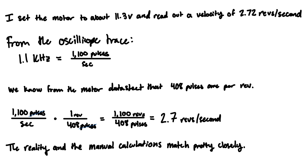 I validated the velocity I got from my program by both counting it and taking an oscilliscope trace and doing some math. I set my motor to about 11.33V and my program showed a velocity of about 2.72 revs/second. I started a timer for about 15 seconds and counted the amount of revolutions I saw. Then I scaled that number down for 1 second which is the velocity my program was outputting. I ended up getting a velocity of about 2.667 revs/second. For the math way I started by taking an oscilscope trace.